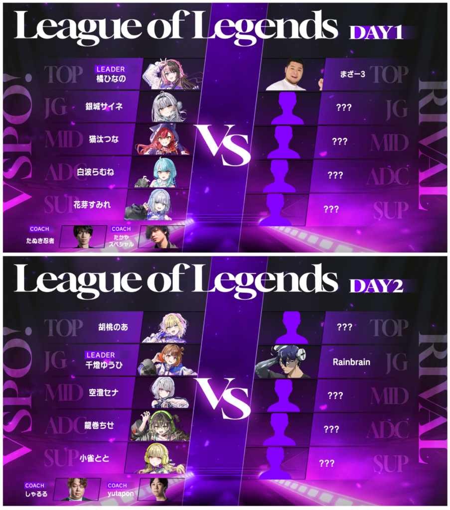 - ぶいすぽっ!チーム:橘ひなの(TOP・リーダー) / 銀城サイネ(JG) / 猫汰つな(MID) / 白波らむね(ADC) / 花芽すみれ(SUP)