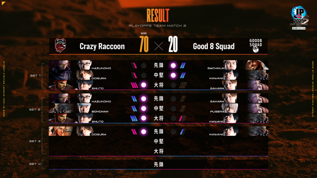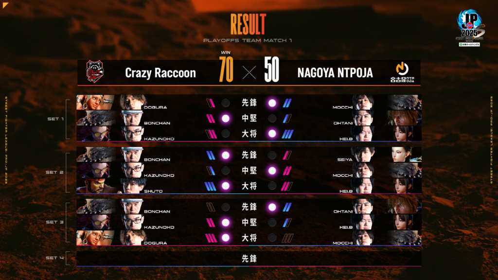 Division Sの初戦は本節2位の名古屋NTPOJA(NTPOJA)対本節3位Crazy Raccoon(CR)です。NTPOJAは本節での勝利ポイント数1位のKEI.B選手を中心としたチームで、CRは現時点でのトップティアであるEDと不知火舞が居ないという個性的なキャラクターを使うチームです。